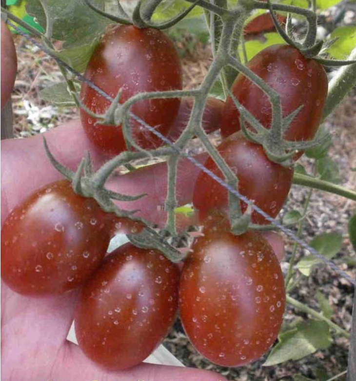 Индет. Среднеспелый. Кисть -6-8 плодов. Плоды сливовидной формы, плотные, блестящие массой до 120г, темно красного цвета с оттенком шоколада.