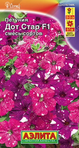 Впервые на рынке из семян! Эксклюзивная новинка чешской селекции – одна из самых популярных расцветок. Неповторимая серия гибридов «Дот Стар» представлена многоцветковой петунией с потрясающим, контрастным рисунком лепестков, повторяющим звездное небо. Каждый цветок индивидуален: форма и количество белых вкраплений меняется в зависимости от погодных условий. Растения высотой 30-35 см. Активно растут и развиваются, формируя симпатичные, плотные кустики с большим количеством цветков  6-7 см. Яркая петуния украсит любую клумбу, вазон, подвесное кашпо, став изюминкой вашего сада!