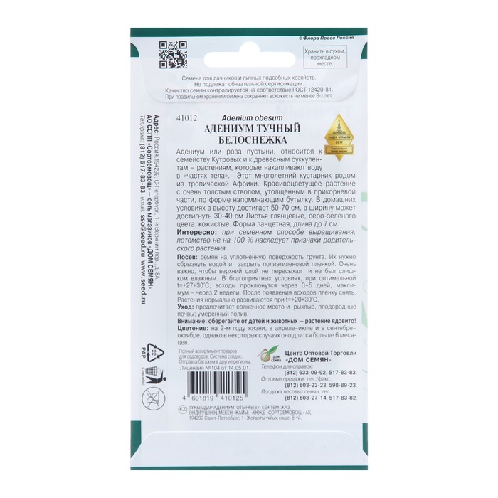 Адениум или роза пустыни, относится к семейству Кутровых и к древесным суккулентам – растениям, которые накапливают воду в «частях тела». Этот многолетний кустарник родом из тропической Африки. Красивоцветущее растение с очень толстым стволом, утолщённым в прикорневой части, по форме напоминающим бутылку. В домашних условиях в высоту достигает 50-70 см, в ширину может достигнуть 30-40 см Листья глянцевые, серо-зелёного цвета, кожистые. Форма ланцетная, длина до 7 см. Интересно: при семенном способе выращивания, потомство не на 100 % наследует признаки родительского растения. Посев: семян в плошки на уплотненную поверхность грунта. Их нужно сбрызнуть водой и закрыть полиэтиленовой пленкой. Очень важно, чтобы верхний слой не пересыхал и не был слишком влажным. В благоприятных условиях, при оптимальной t=+27+300С, всходы проклюнутся через 3–5 дней, максимум – через 2 недели. После появления всходов пленку снять. Растения нормально развиваются при t=+20+300С. Уход: предпочитает солнечное место и рыхлые, плодородные почвы; умеренный полив. Внимание: оберегайте от детей и животных — растение ядовито.Цветение: на 2-м году жизни, в апреле–июле и в сентябре–октябре, однако в некоторых случаях оно длится больше 6 месяцев.