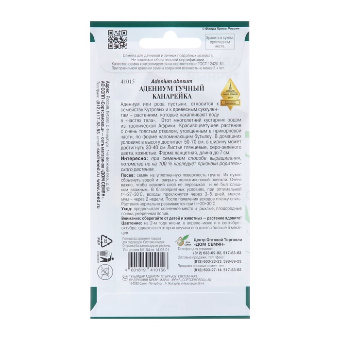 Адениум или роза пустыни, относится к семейству Кутровых и к древесным суккулентам – растениям, которые накапливают воду в «частях тела». Этот многолетний кустарник родом из тропической Африки. Красивоцветущее растение с очень толстым стволом, утолщённым в прикорневой части, по форме напоминающим бутылку. В домашних условиях в высоту достигает 50-70 см, в ширину может достигнуть 30-40 см Листья глянцевые, серо-зелёного цвета, кожистые. Форма ланцетная, длина до 7 см. Интересно: при семенном способе выращивания, потомство не на 100 % наследует признаки родительского растения. Посев: семян в плошки на уплотненную поверхность грунта. Их нужно сбрызнуть водой и закрыть полиэтиленовой пленкой. Очень важно, чтобы верхний слой не пересыхал и не был слишком влажным. В благоприятных условиях, при оптимальной t=+27+300С, всходы проклюнутся через 3–5 дней, максимум – через 2 недели. После появления всходов пленку снять. Растения нормально развиваются при t=+20+300С. Уход: предпочитает солнечное место и рыхлые, плодородные почвы; умеренный полив. Внимание: оберегайте от детей и животных — растение ядовито.Цветение: на 2-м году жизни, в апреле–июле и в сентябре–октябре, однако в некоторых случаях оно длится больше 6 месяцев.