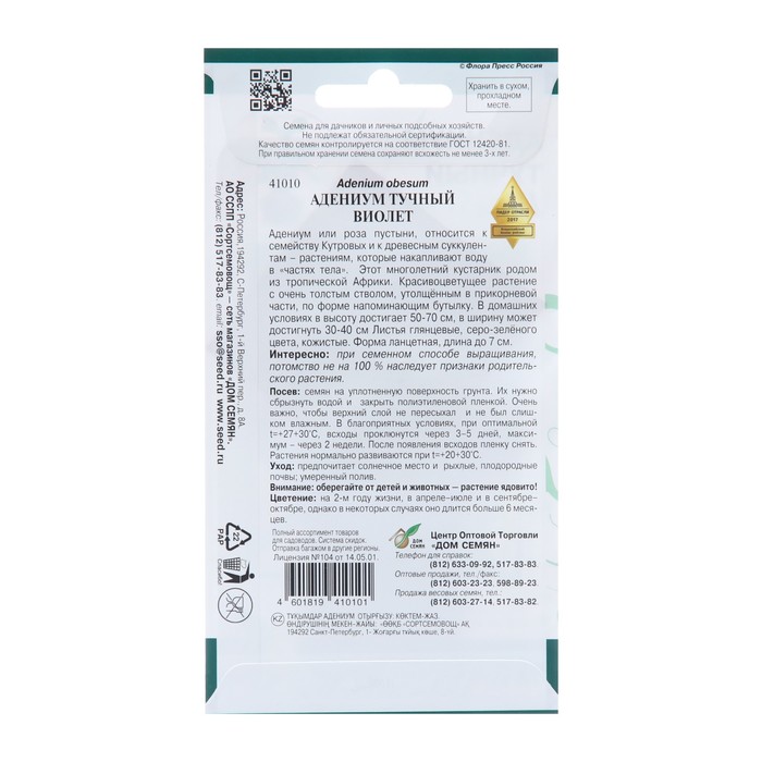 Адениум или роза пустыни, относится к семейству Кутровых и к древесным суккулентам – растениям, которые накапливают воду в «частях тела». Этот многолетний кустарник родом из тропической Африки. Красивоцветущее растение с очень толстым стволом, утолщённым в прикорневой части, по форме напоминающим бутылку. В домашних условиях в высоту достигает 50-70 см, в ширину может достигнуть 30-40 см Листья глянцевые, серо-зелёного цвета, кожистые. Форма ланцетная, длина до 7 см. Интересно: при семенном способе выращивания, потомство не на 100 % наследует признаки родительского растения. Посев: семян в плошки на уплотненную поверхность грунта. Их нужно сбрызнуть водой и закрыть полиэтиленовой пленкой. Очень важно, чтобы верхний слой не пересыхал и не был слишком влажным. В благоприятных условиях, при оптимальной t=+27+300С, всходы проклюнутся через 3–5 дней, максимум – через 2 недели. После появления всходов пленку снять. Растения нормально развиваются при t=+20+300С. Уход: предпочитает солнечное место и рыхлые, плодородные почвы; умеренный полив. Внимание: оберегайте от детей и животных — растение ядовито.Цветение: на 2-м году жизни, в апреле–июле и в сентябре–октябре, однако в некоторых случаях оно длится больше 6 месяцев.