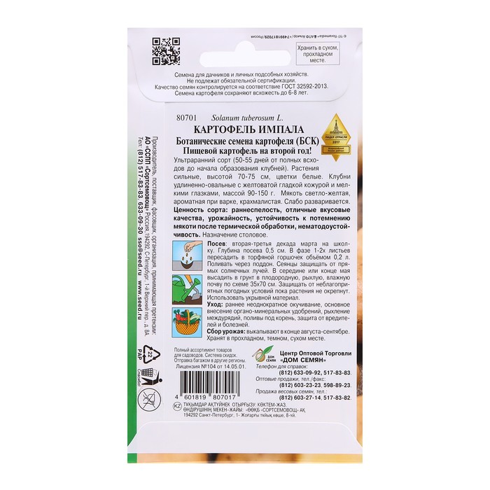 Очень ранний сорт, столового назначения. Куст средний. Клубни овальные. Кожура желтая, гладкая. Глазки мелкие. Мякоть светло-желтая, с хорошим вкусом. Содержание крахмала 10,2–11,5%. Масса товарного клубня 90–150 г. Устойчив к раку, картофельной нематоде. Лежкость хорошая, период покоя клубней продолжительный. Отличается дружной отдачей раннего урожая. Своевременная уборка, соблюдение агротехнических и профилактических мероприятий позволяет полностью избежать поражения заболеваниями и вредителями. Идеален для ранних рыночных продаж. Товарность 98%. Урожайность 50–55 т/га. Сроки посева — вторая половина апреля. Глубина заделки семян — 0,5 см. Почва для посева — смесь из дерновой земли, торфа и песка в соотношении 3:2:1 Пикировка: подросшую рассаду картофеля обязательно пересаживать в отдельные емкости. До появления всходов ящик накрывают стеклом или пленкой, чтобы создать благоприятные условия для прорастания семян. Пересадка в грунт – её проводят при относительно тёплой, но не жаркой погоде. Молодые растения картофеля очень нежные, их нужно защитить от прямых солнечных лучей, ветра, перепадов температуры, вредителей. Уход почти не отличается от привычной агротехники — подкормки, прополки, окучивание.