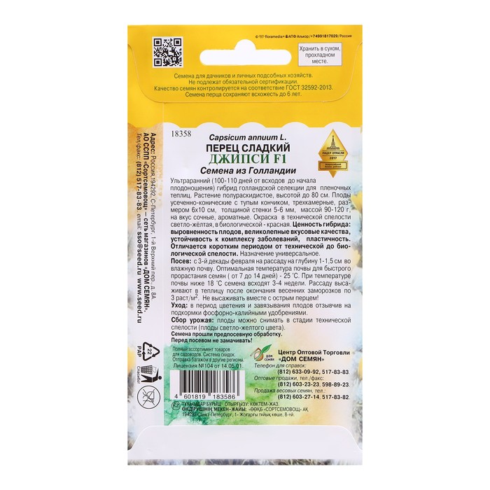 Ультраранний (100-110 дней от всходов до начала плодоношения) гибрид голландской селекции для пленочных теплиц. Растение полураскидистое, высотой до 80 см. Плоды усеченно-конические с тупым кончиком, трехкамерные, размером 6х10 см, толщиной стенки 5-6 мм, массой 90-120 г, на вкус сочные, ароматные. Окраска в технической спелости светло-жёлтая, в биологической - красная. Ценность гибрида: выровненность плодов, великолепные вкусовые качества, устойчивость к комплексу заболеваний, пластичность. Отличается коротким периодом от технической до биологической спелости. Назначение универсальное.Посев: с 3-й декады февраля на рассаду на глубину 1-1,5 см во влажную почву. Оптимальная температура почвы для быстрого прорастания семян ( от 7 до 14 дней) - 25 С. При температуре почвы ниже 18 С семена всходят 3-4 недели. Рассаду высаживают в теплицу после окончания весенних заморозков по 3 раст/м2. Не высаживать вместе с острым перцем!Уход: в период цветения и завязывания плодов отзывчив на подкормки фосфорно-калийными удобрениями.Сбор урожая: плоды можно снимать в стадии технической спелости (плоды светло-желтого цвета). Семена прошли предпосевную обработку. Перед посевом не замачивать!