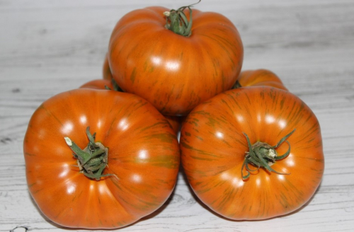 Высокорослый, среднеранний, очень урожайный сорт! Новинка из Франции! Плоды крупные, одномерные, мелких нет совсем, достигают веса до 600 гр. В кисти до 6 крупных томатов Очень красивый сорт - цвет охры расписан изумрудными полосками. Плоды мясистые, «сливочные», сочные, очень вкусные, сладкие, с мягким фруктово-дынным ароматом, приятным сладким послевкусием.