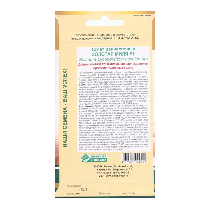 Раннеспелый детерминантный гибрид, плоды которого так и просятся в руки. Высота растений до 1 м. От всходов до начала плодоношения 95-100 дней. Первое соцветие закладывается над 6-7 листом, последующие через 2 листа. Кисти простые с 5-7 плодами красивого оранжевого цвета. Масса плодов 200-220 г. Томаты округлые с красивым носиком, 3-4-камерные. Стенки плодов толстые, плотные, мякоть сочная, очень вкусная. Гибрид отлично хранится, имеет хорошую транспортабельность. Прекрасно подходит для свежего потребления, засолки и всех видов консервирования. Гибрид устойчив к бурой пятнистости, вирусу мозаики томата, бактериальному увяданию. Плотность посадки 3-4 растения/м2. Рекомендуем выращивать в 2-3 стебля. Урожайность до 25,0 кг/м2 в защищенном грунте и до 20,0 кг/м2 в открытом грунте.