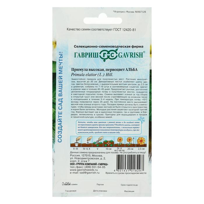 Зимостойкая примула для полутенистых мест. Растение многолетнее, высотой до 20 см. Декоративные листья окаймляют шапку цветов. Цветки белоснежные, с выразительным желтым центром, до 2,5 см в диаметре, собраны по 7-10ук в зонтиковидные соцветия. Цветет в апреле-мае в течение 40-45 дней. Предпочитает рыхлые, достаточно увлажненные плодородные почвы в полутенистых местах, нуждается в ежегодной подсыпке почвы. Семена высевают осенью в год сбора в открытый грунт или весной после стратификации на влажном песке в холодильнике в течение 3-4 недель. При температуре почвы 10 °C всходы появляются через 25 дней. На постоянное место высаживают весной или осенью второго года. Посадки примул должны быть сомкнутыми, чтобы между розетками листьев не было открытого пространства, и корни были затенены. Молодые растения зацветают на второй — третий год. Хорошо выглядят как в одиночных посадках, так и группами, в бордюрах, великолепны в срезке. Пригоден для выращивания и продаж в горшечной культуре, особенно зимой.