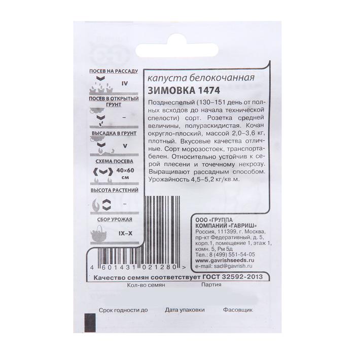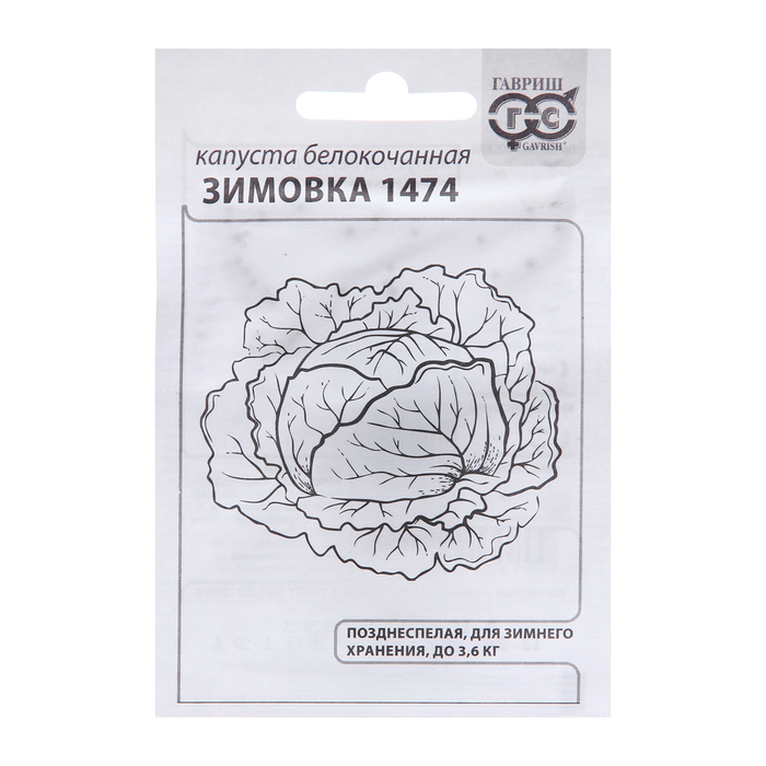 Семена Капуста Зимовка 1474 белокочанная. Сорт позднеспелый, от всходов до технической спелости 130-150 дней. Кочаны округло-плоские, очень плотные, массой 2,0-3,6 кг. Транспортабельность высокая. Урожайность 5,0-6,0 кг/м2. Отличается высокой лежкостью при зимнем хранении. Товарность за 6 месяцев хранения – 80-90%. При благоприятных условиях кочаны сохраняются до июня. По мере хранения вкусовые качества кочанов улучшаются. Используется в свежем виде во второй половине зимы. Агротехника. Посев семян на рассаду. При выращивании рассады очень важно поддерживать температурный режим: днем 15-18°С, ночью 12-14°С. Высадка рассады в грунт в возрасте 40-45 дней, в фазе пяти-шести настоящих листьев. Растениям необходимы регулярные поливы, прополки, рыхления и подкормки.