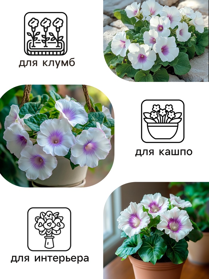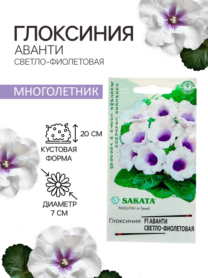 Роскошное и очень модное среди цветоводов комнатное растение из семейства Геснериевые. Самая рано зацветающая серия среди немахровых глоксиний. Цветки колокольчатой формы, разнообразной окраски, с приятной бархатистой поверхностью венчают длинные цветоносы. Широкоовальные листья на коротких черешках украшают основание цветоноса. На взрослом растении образуется 10-15 крупных цветков, создавая впечатление нарядного букета. Глоксиния предпочитает светлые, солнечные места без воздействия прямых солнечных лучей. Идеальная температура для роста — 20°С - 25°С днем и 18°С – 22°С ночью. Во время цветения необходим обильный полив, еженедельные подкормки, влажный воздух (опрыскивание из пульверизатора). В октябре-ноябре, после цветения, полив и подкормку прекращают. Когда листья глоксинии засохнут, клубни вынимают из почвы и помещают на хранение в неглубокие ящички с чуть влажным песком или перлитом, которые устанавливают в помещении с температурой 10-12°С. После периода покоя (примерно 90 дней) клубни дадут новые ростки и их снова можно будет пересаживать в горшок. Семена на рассаду высевают поверх субстрата (не заделывая в почву) с февраля по март, накрывают стеклом и ставят в теплое, светлое место. Всходы появляются при температуре 22-24°С, через 10-14 дней. В фазе 3-х листьев растения пикируют, через месяц рассаживают в отдельные горшки. Зацветает глоксиния выращенная из семян через 9-10 месяцев.
