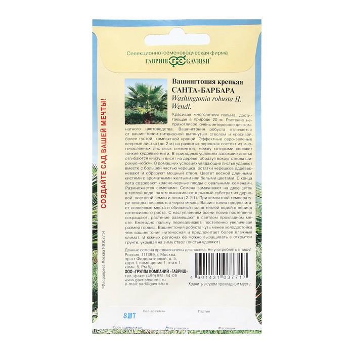 «Санта-Барбара» — это красивая многолетняя пальма, которая в природе достигает 20 м в высоту. Отличается от нитеносной вашингтонии вытянутым стволом и густой компактной кроной.