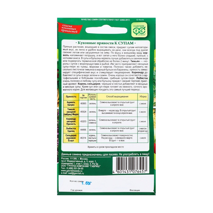 Пряные растения (кервель, кориандр, любисток, листовой сельдерей, тимьян), вошедшие в состав смеси придают супам неповторимый вкус, их легко и удобно выращивать на даче, они всегда под рукой, свежие — летом или засушенные на зиму. По вкусу и внешнему виду кервель напоминает петрушку, а вот запах у него более сладкий, пряный с нотками аниса. В супы и бульоны кервель лучше добавлять в свежем виде, или подвергать термической обработке не более 2-х минут. Тимьян «король» супов с морепродуктами и рыбой. Им часто приправляют овощные супы-пюре из тыквы, моркови и томатов. Полезно также добавить несколько листочков тимьяна в жирный бульон из баранины, пряность замаскирует специфический вкус и стимулирует пищеварение. Кориандр добавляют в супы в виде зелени и семян. Очень хорошо он сочетается с картофельными и бобовыми похлебками, грибным супом-пюре. Сельдерей листовой и любисток похожи внешне и запахом. Оба растения очень полезны, любому супу или бульону они передадут свой терпкий, свежий, приятный аромат. Холодный суп-пюре из сельдерея - самый лучший перекус для желающих похудеть.