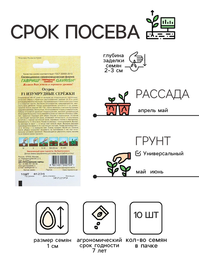 «F1 Изумрудные серёжки» — это скороспелый партенокарпический гибрид с букетным заложением завязей, у которого период от всходов до появления огурцов составляет 42–47 дней. Отличается дружным плодоношением, высокой урожайностью и прекрасно подходит для сбора на пикули и корнишоны. Устойчив к настоящей и ложной мучнистой росе, оливковой пятнистости, корневым гнилям и бактериозу. Предназначен для культивирования в теплицах, под временными плёночными укрытиями и в открытом грунте.