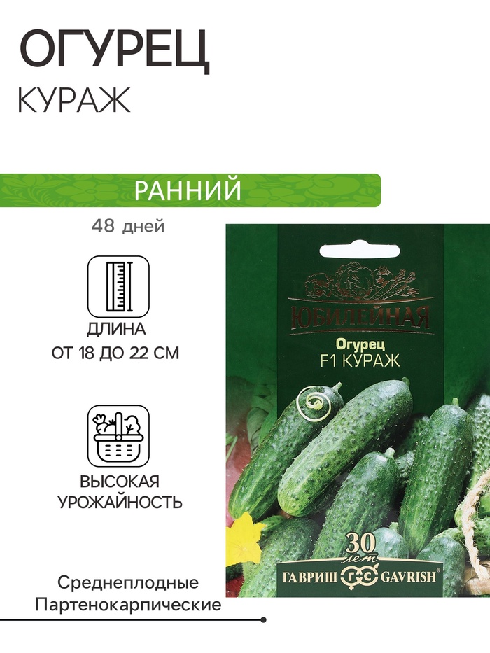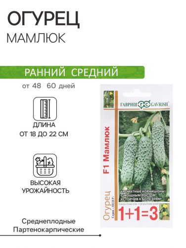 Скороспелый партенокарпический гибрид (от всходов до плодоношения 45-50 дней), женского типа цветения, предназначен для выращивания в пленочных теплицах. Растения сильнорослые, побегообразовательная способность средняя. В узлах образуется по 2-4 завязи (до 5-6ук). Зеленец темно-зеленый со светлыми полосами, длиной 12-15 см, массой 120-130 г, бугорчатый, белошипый, универсального использования. Вкусовые качества высокие, без горечи. Плотность посадки 2,5-3,0 растения/м2. Относительно устойчив к основным заболеваниям огурца. Урожайность 6,0-8,0 кг/растение.