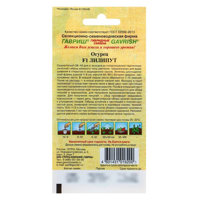 Посев: на рассаду с конца апреля по начало мая. Помещайте молодые растения в грунт с конца мая по начало июня в фазе 2–3 настоящих листьев под временные плёночные укрытия. Сейте в открытую почву с конца мая по начало июня. Для получения пикулей производите сбор ежедневно, а для корнишонов — через день. При нерегулярной уборке урожая плоды утолщаются. Оптимальная температура почвы для семян — 25–30 °C.
