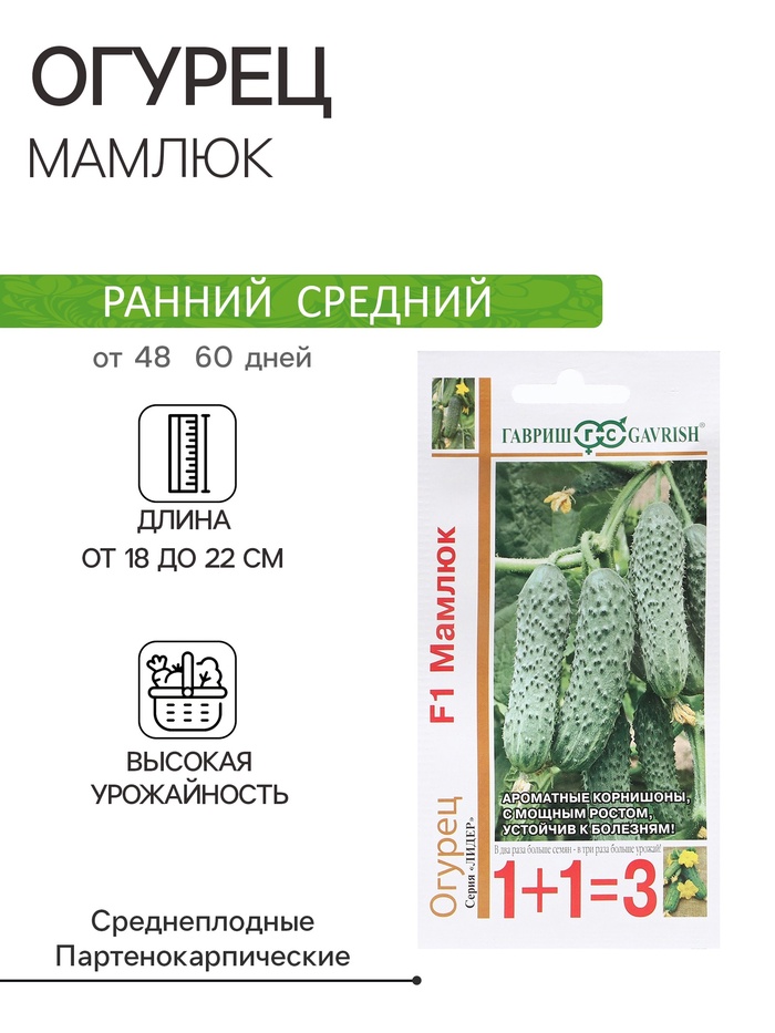 Растения партенокарпического типа, в них нет семян, подходящих для размножения. Гибрид имеет большое количество боковых побегов. Основная плеть достигает 2,5 м, боковые – около 1 м. Высоту огурца Мамлюк при выращивании в теплице или в открытом грунте нужно нормировать, чтобы повысить урожайность.Гибрид Мамлюк относится к растениям раннего срока созревания, или, как говорят в народе, огурцы скороспелые. Первые плоды собирают через 35-40 дней с момента всходов. Плодоношение продолжается почти 2 месяца. Вкусовые качества на протяжении всего периода отличные.