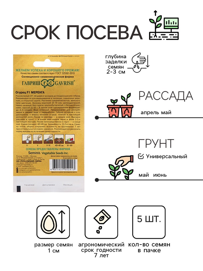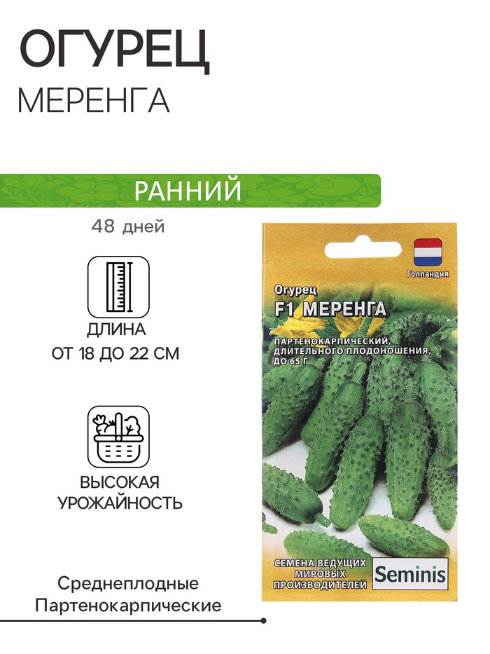 Раннеспелый (37-40 дней от всходов до плодоношения) гибрид. Рекомендуется для выращивания в теплицах, пленочных укрытиях, в открытом грунте. Растение индетерминантное, среднеплетистое, женского типа цветения. Зеленец короткий (8-10 см), цилиндрический, темно-зеленый, без горечи, крупнобугорчатый, с белым опушением, массой до 65 г. В одном узле одновременно формирует до 4-5 плодов. Вкус отличный. Предназначен для употребления в свежем виде и переработки. Гибрид устойчив к кладоспориозу, к вирусу мозаики огурца, ложной и настоящей мучнистой росе. Посев на рассаду — в начале мая. Высадка рассады в грунт — в конце мая-начале июня в фазе 2-3-х настоящих листьев. Посев непосредственно в грунт-в конце мая. Схема посадки: 40х40 см. Урожайность 15,2 кг/кв.м. Семена после уборки сохраняют всхожесть в течение 7 лет при оптимальных условиях хранения. Рекомендуется увеличить норму высева по окончании срока годности.