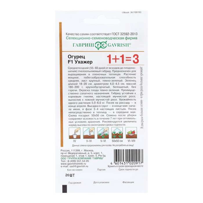 Ухажер — среднепоздний (55-60 дней от всходов до плодоношения) пчелоопыляемый гибрид для выращивания в теплицах. Растение мощное, лист крупный, темно-зеленый. Зеленец длиной 18-20 см, диаметром 4,0-4,5 см, массой 180-200 г, крупнобугорчатый, белошипый, без горечи. Окраска плода темно-зеленая. Преимущественно салатного назначения. Гибрид устойчив к корневым гнилям, настоящей мучнистой росе, вынослив к ложной мучнистой росе. Урожайность одного растения 5,0-6,0 кг. Посев на рассаду — в конце апреля. Высадка в грунт — в конце мая-начале июня в фазе 3-4-х настоящих листьев. Посев непосредственно в теплицу — в середине мая. Схема посадки: 50х50 см. Семена после уборки сохраняют всхожесть в течение 7 лет при оптимальных условиях хранения. Рекомендуется увеличить норму высева по истечение срока годности.