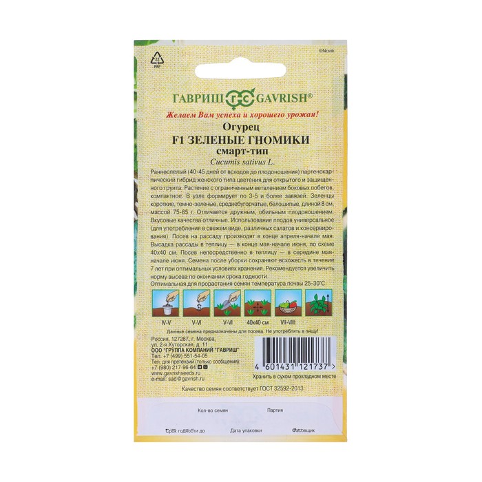 Скороспелый, 40-45 дней от всходов, партенокарпический гибрид для пленочных теплиц и открытого грунта. Растение компактное с ограниченным ветвлением женского типа цветения. В узле от 3-5 завязей и более. Плод темно-зеленый, бугорчатый, со слабой крапчатостью, белошипый длиной 8 см, массой 75-85 г. Отличается ранним, обильным, дружным плодоношением. Вкусовые качества отличные. Рекомендуется для употребления в свежем виде, различных салатов и консервирования. Посев на рассаду — в конце мая. Высадка в теплицу — в конце мая-начале июня, по схеме 40х40 см. Посев непосредственно в теплицу — в середине мая. Семена после уборки сохраняют всхожесть в течении 7 лет при оптимальных условиях хранения. Рекомендуется увеличить норму высева по окончании срока годности.