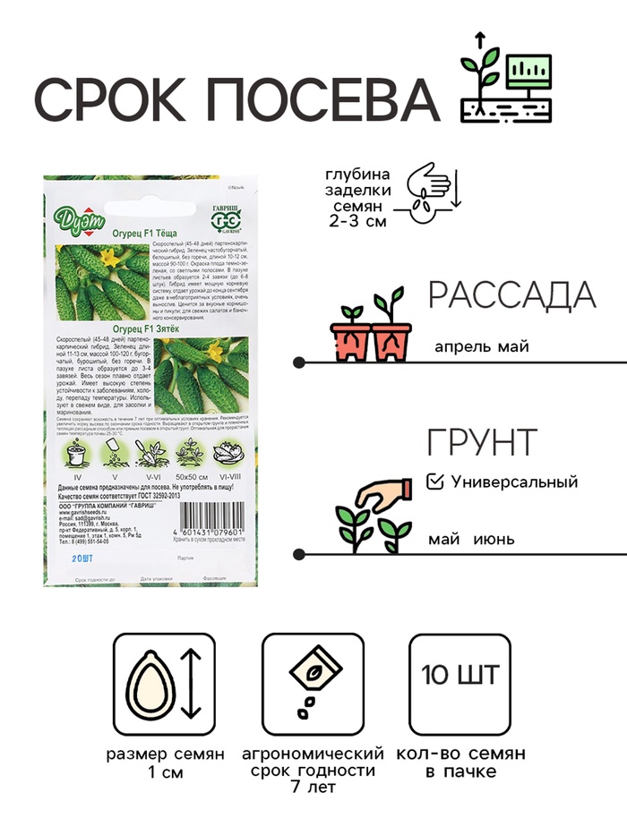 Скороспелый (45-48 дней) партенокарпический гибрид. Зеленец частобугорчатый, белошипый, без горечи, длиной 10-12 см, массой 90-100 г. Окраска плода темно-зеленая со светлыми полосами. В пазухе листьев образуется 2-4 завязи (до 6-8ук). Имеет мощную корневую систему, интенсивный рост, отдает урожай до конца сентября даже в неблагоприятных условиях, очень вынослив. Ценится за вкусные корнишоны и пикули, пригодные для баночного консервирования. Огурец Теща: Скороспелый (45-48 дней) партенокарпический гибрид. Зеленец длиной 11-13 см, массой 100-120 г, бугорчатый, бурошипый, без горечи. В пазухе листа образуется до 3-4-х завязей. Весь сезон плавно отдает урожай. Имеет высокую степень устойчивости к заболеваниям, холоду, перепаду температуры. Используют в свежем виде, для засолки и маринования.