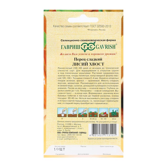Раннеспелый (100-105 дней от всходов до технической спелости) сорт. Для выращивания в открытом грунте и под пленочными укрытиями. Растение среднерослое, компактное, плоды пониклые, конусовидной формы массой 120-130 г. Толщина стенки 2-4 мм. Окраска незрелых плодов зеленая, зрелых — оранжевая. Мякоть сладкая, вкусная, ароматная. Рекомендуется для использования в свежем виде, салатов, домашней кулинарии и консервирования. Посев на рассаду — в начале марта. Глубина заделки семян до 1 см. Пикировка — в фазе семядолей. Высадка в грунт — в конце мая. Формировка: удаление всех боковых побегов и листьев до первой развилки. Схема посадки: 30х40 см. Нельзя высаживать рассаду сладких и острых сортов перца рядом, т.к. происходит переопыление и сладкий перец приобретает горький вкус.