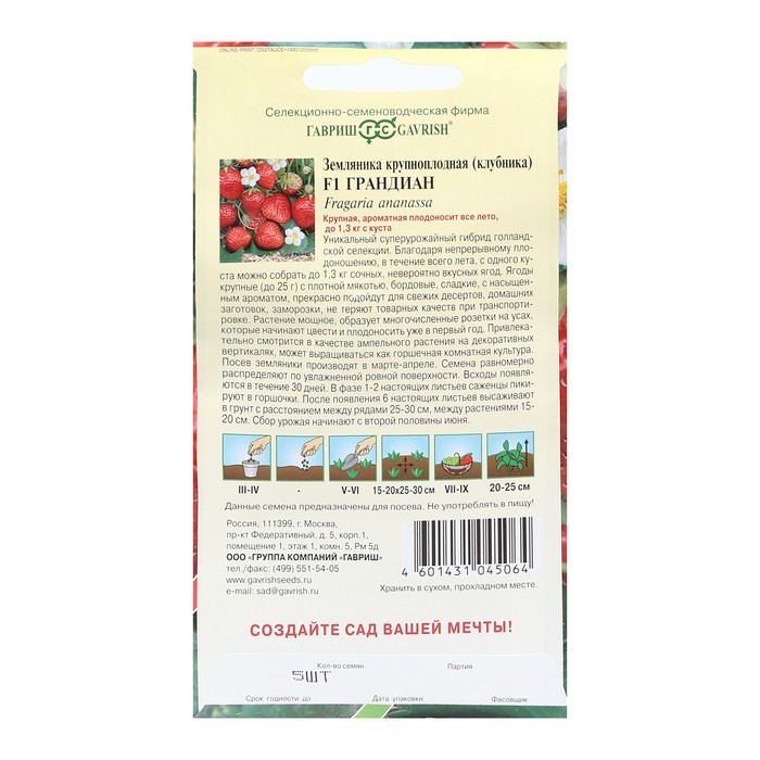 Уникальный суперурожайный гибрид голландской селекции. Благодаря непрерывному плодоношению, в течение всего лета, с одного куста можно собрать до 1,3 кг сочных, невероятно вкусных ягод. Ягоды крупные (до 25 г) с плотной мякотью, бордовые, сладкие, с насыщенным ароматом, прекрасно подойдут для свежих десертов, домашних заготовок, заморозки, не теряют товарных качеств при траспортировке. Растение мощное, образует многочисленные розетки на усах, которые начинают цвести и плодоносить уже в первый год. Привлекательно смотрится в качестве ампельного растения на декоративных вертикалях, может выращиваться как горшечная комнатная культура. Посев земляники производят в марте-апреле. Семена равномерно распределяют по увлажненной ровной поверхности. Всходы появляются в течение 30 дней. В фазе 1-2 настоящих листьев саженцы пикируют в горшочки. После появления 6 настоящих листьев высаживают в грунт с расстоянием между рядами 25-30 см, между растениями 15-20 см. Сбор урожая начинают с второй половины июня.