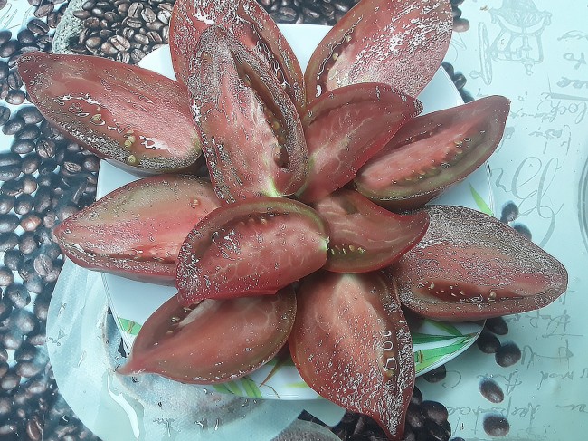 Алмандин (Almandine, Dwarf Almandine) — среднеспелый сорт томатов, один из интереснейших «гномов» с плодами-сливками в оттенках от кирпично-коричневого до спелой вишни. Куст мощный, невысокий, всего 60-70 см. Листья крупные, морщинистые. Для максимальной отдачи урожая рекомендована подвязка и формирование в 2-3 стебля. Плоды многочисленные, чуть более округлые, чем классическая сливка, массой 100-150 г.