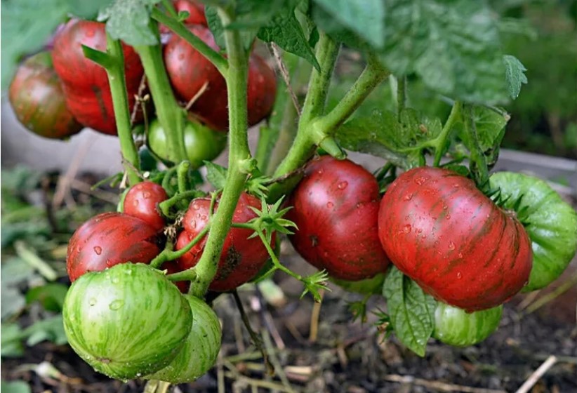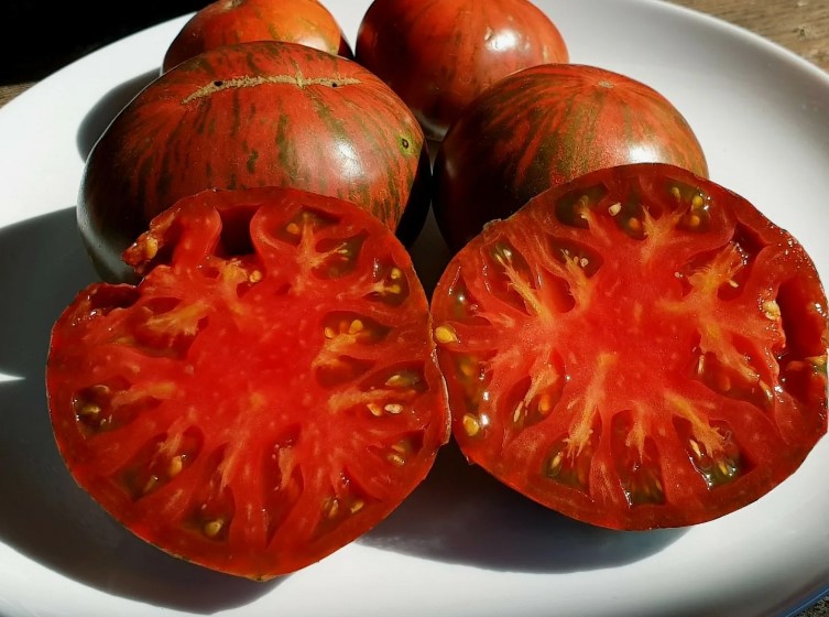 Гном Стринги - полудетерминантый -от 0.8 м в ОГ, до 1.5м-в теплице. Ствол штамбовый мощный и крепкий. Среднеспелый -95-110 дней. Вес плодов 150-350 грамм. Отличная урожайность наблюдается при формировании куста в 2-3 стебля. Плоды плоскоокруглые розово-пурпурно-оливковые с антоциановым отливом около плодоножки. Мякоть темно-вишневая, сочная, мясистая, сладкая. Вкусны они в свежем виде, подойдут также для приготовления сока, соуса, пасты. Обладает стойким иммунитетом к вирусным, грибковым и бактериальным болезням.