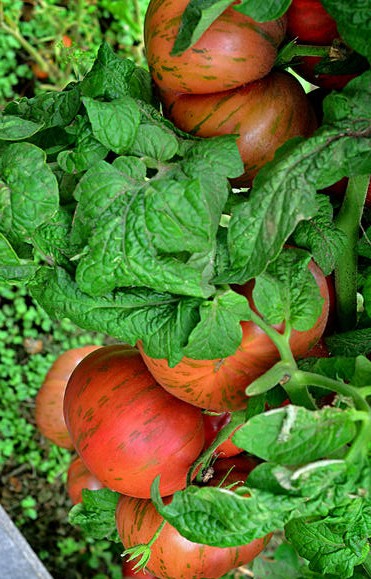 В теплице до 1 м. Среднеспелый. Помидоры плоскокруглой формы, масса 80-250 грамм. На темно-вишневом фоне темные полоски, на разрезе бордовые. Мясистые, пряный сбалансированный вкус. Отличный салатный сорт.
