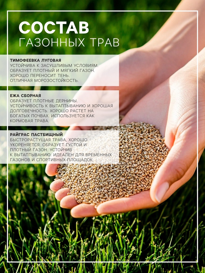 Состав газонных трав: Райграс пастбищный, Тимофеевка луговая, Ежа сборная