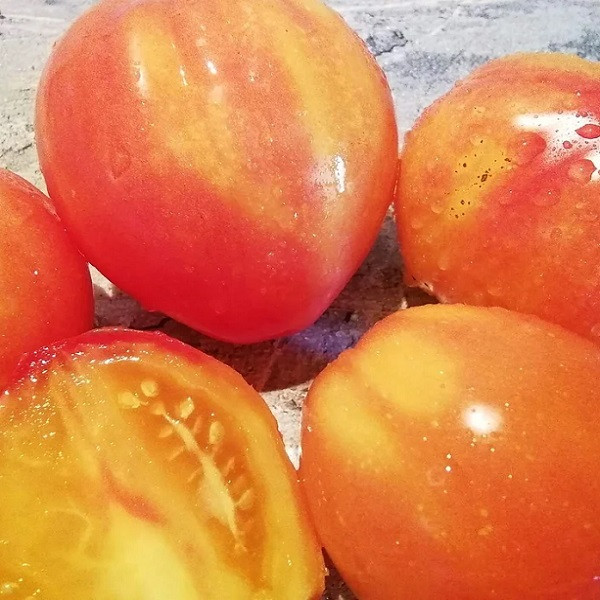 Высокорослый очень урожайный сорт с двухцветными плодами в форме большой сливы. Вес в среднем 100-150г. Очень сладкие!