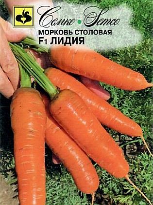 Морковь Лидия F1 - среднеранний гибрид моркови сортотипа Шантенэ. От всходов до уборки 115-120 дней. Розетка листьев полупрямостоячая. Корнеплоды треугольной формы, с тупым, закруглённым кончиком, гладкие, ярко-оранжевые, головка корнеплода маленькая, не зеленеет и без антоциановой окраски. При выращивании на ровной поверхности длина корнеплода 13-15 см, на гребнях или грядах длина до 19-20 см, диаметром 4-5 см, массой 100-130 г. Сердцевина средняя. Вкус отличный, мякоть плотная, сочная, сладкая. Содержание сухого вещества 11-13%, общего сахара до 6 %, бета-каротина 12-14 мг%. Товарность и транспортабельность высокие. Устойчив к цветушности. Товарность 85-95%. Используется для потребления в свежем виде, консервирования, переработки и хранения 5-6 месяцев. Густота посева 0,8-1 млн. семян/га, схема посева 45х5 см. Урожайность 8-9 кг/м.
