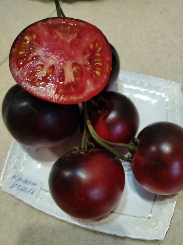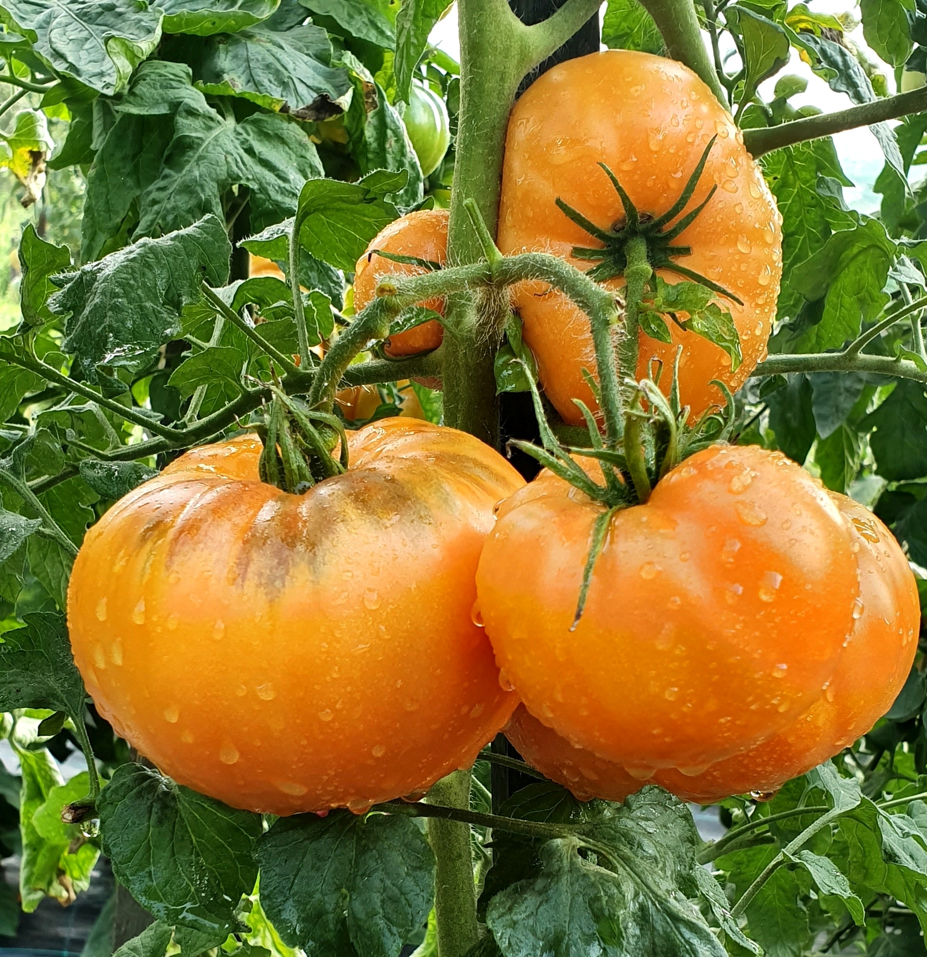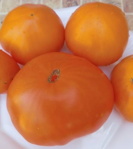 Старинная семейная реликвия из Германии. Плоды ярко-оранжевые, бифштексного типа, очень мясистые, многокамерные, гладкие, устойчивые к растрескиванию. Масса плодов 350 - 720 г. Мякоть оранжевая, почти красная, сочная, превосходная на вкус. Среднеспелый, урожайный сорт.