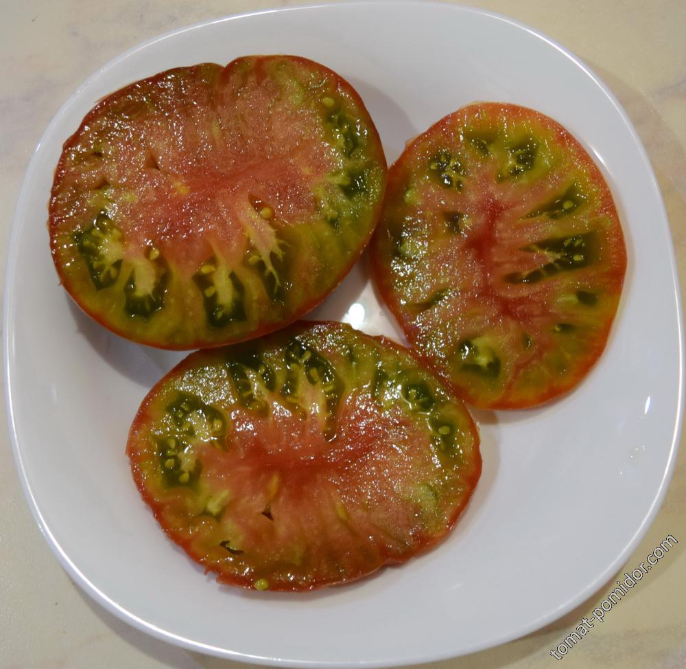 Этот редкий томатный сорт будет находкой для любителей экзотики. Медная река – калифорнийская новинка красивых трехцветных (даже многоцветных) помидоров. В этом сорте привлекать может многое – гигантские размеры, удивительная и неповторимая окраска, а вкус такой, словно это деликатес.Сорт полудетерминантный, иногда его относят к индетерминантным. В любом случае это среднерослый куст. Высота разнится в зависимости от места произрастания: в теплице она может достигать отметки 1,5-1,8 м, в то время как на грядках, на открытом воздухе вырастает не более 80 см.Вкус Медной реки – еще одна особенность этого сорта. Мякоть, которая, впрочем, тоже разноцветная (на зеленом фоне розовые, светло-желтые, даже красные вкрапления), не только сладковатая, с фруктовым привкусом, но еще и очень нежная, маслянистая, буквально тает во рту. В нарезке овощ смотрится прекрасно, сможет украсить собой любое праздничное застолье.