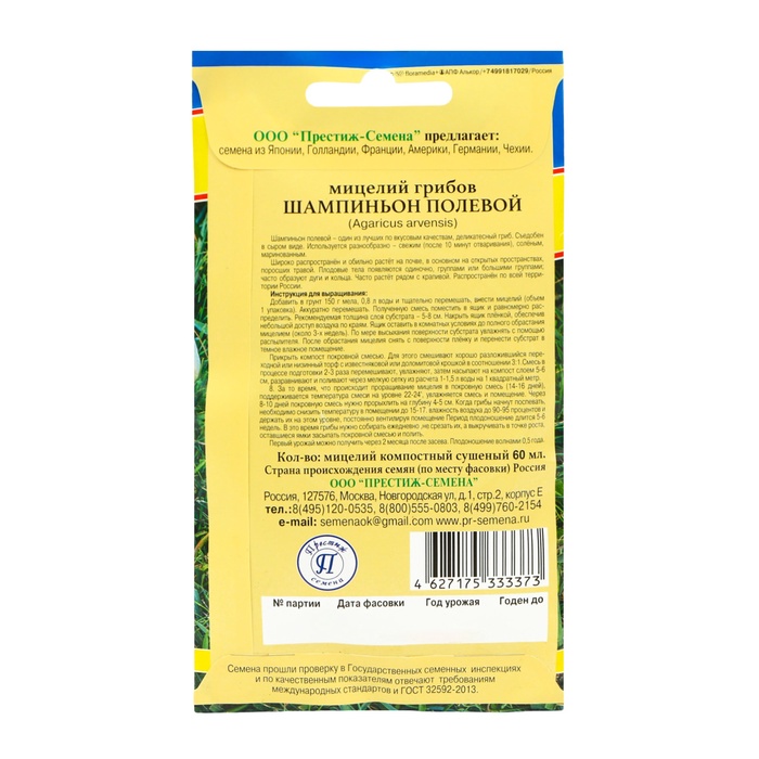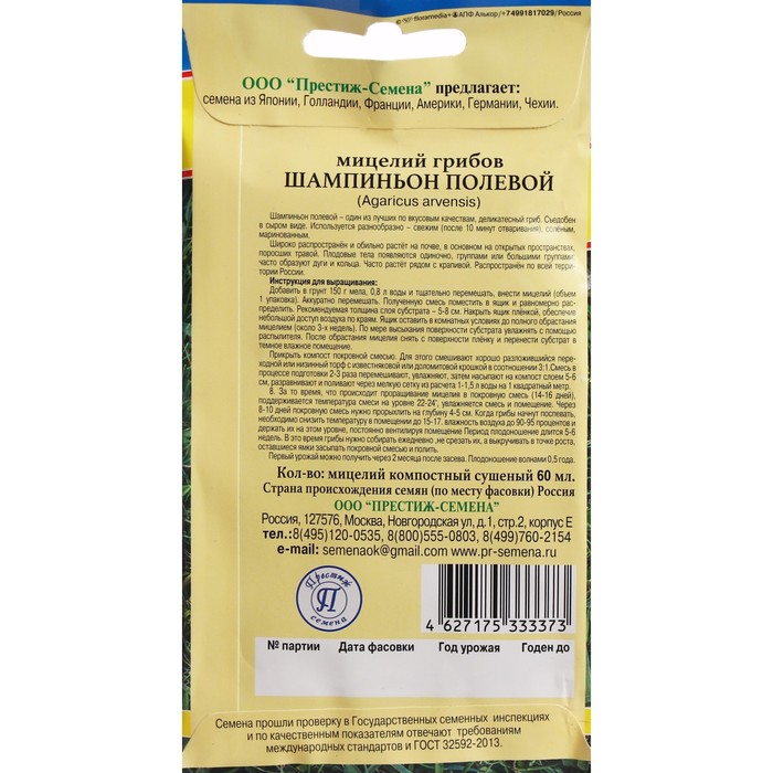 Семена Мицелий "Шампиньон Полевой", 60 мл