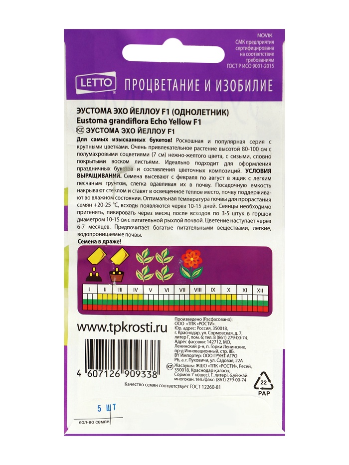 Семена цветов «Эустома Эхо Йеллоу», жёлтая, драже, 5. — многолетнее растение, выращиваемое как комнатное и однолетнее. Нежные жёлтые махровые цветки, похожие на розы, продолжительно сохраняют декоративность. Требуется лёгкая почва. В грунт добавьте песок, торф и толчёную кору или субстрат для орхидей. Для выращивания желательна прохлада, оптимальная температура воздуха: 18–22 °С. Требуется светлое местоположение, но от прямых солнечных лучей необходимо притенять. «Эхо F1» — цветы с длинными цветоносами, пригодными для срезки и составления букетов.