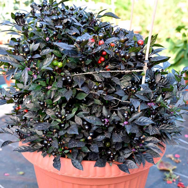 Компактный и очень декоративный перец. Листья, особенно при солнечном местоположении, приобретают тёмно-фиолетовый оттенок. Незрелые плоды, по форме напоминающие жемчужины, чёрно-фиолетового цвета, блестящие. По мере созревания плоды становятся красными.