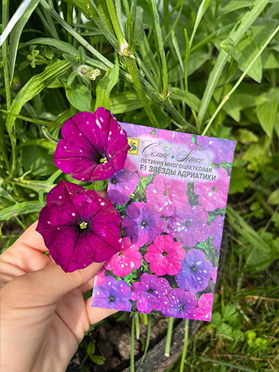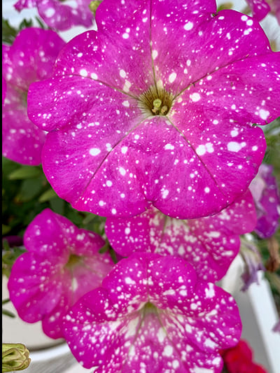 Гибрид петунии серии ДОТ СТАР, среднего срока цветения, смесь. Растение высотой 30-35 см, отличается повышенным ветвлением. Цветение обильное, продолжительное, цветки диаметром 6-7 см оригинальной насыщенно-розовой и фиолетовой окраски. Уникальность расцветки – на ярком розовом и фиолетовом фоне разбросаны крапинки и пятна белого цвета - будто звездное небо или ранняя снежная пороша. Интенсивность, размер и форма этих вкраплений могут видоизменяться от температуры и влажности. При этом цветки отличаются повышенной устойчивостью к неблагоприятным погодным условиям, после дождя быстро восстанавливают внешний вид. Семена мелкие, посев поверхностный. Температура прорастания +23-25°С. Гибридные петунии серии ДОТ СТАР прекрасное украшение для клумб, вазонов и всевозможных архитектурных садовых форм.