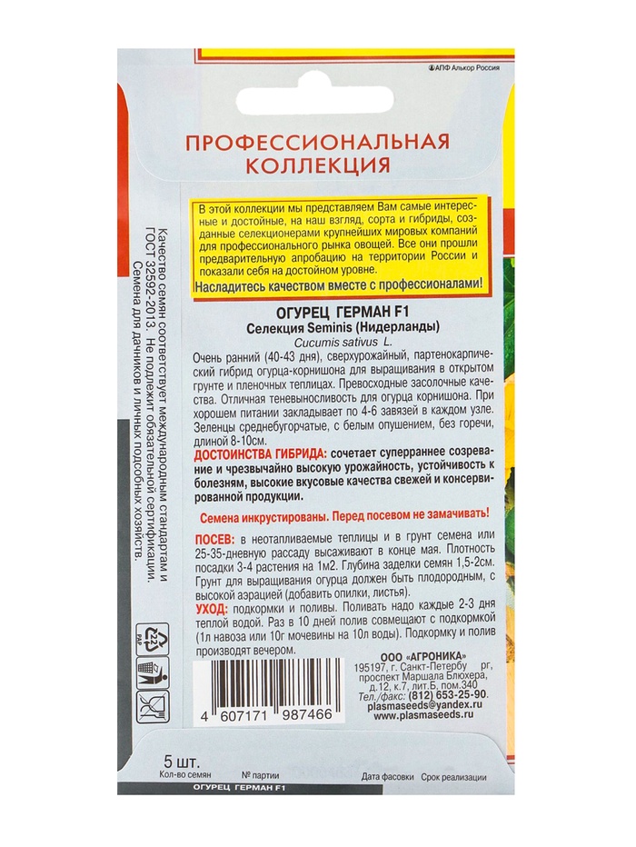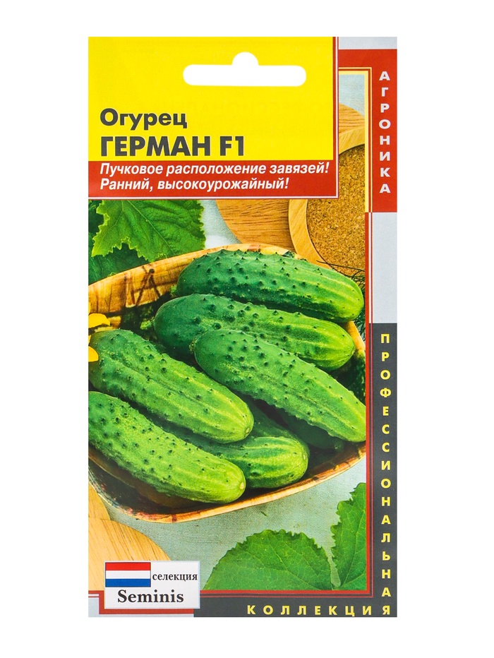 Очень ранний (40-43 дня), сверхурожайный, партенокарпический гибрид огурца-корнишона для выращивания в открытом грунте и пленочных теплицах. Превосходные засолочные качества. Отличная теневыносливость для огурца корнишона. При хорошем питании закладывает по 4-6 завязей в каждом узле. Зеленцы среднебугорчатые, с белым опушением, без горечи, длиной 8-10см.