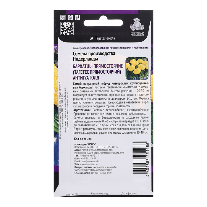 Самый популярный гибрид низкорослых крупноцветковых бархатцев! Растения генетически компактные с отличным базальным ветвлением. Высота растения 20-30 см. Формирует многочисленные прочные цветоносы с густомахровыми крупными цветками диаметром 8-10 см. Окраска цветка золотисто-желтая. Превосходен в озеленении широких массивов и посадки в горшки, контейнеры.Агротехника. Растение теплолюбивое, засухоустойчивое. Предпочитает солнечное место, к почвам не требовательно. Семена высевают в феврале-марте в рассадные ящики. Глубина заделки семян 0,5-1 см. При температуре +18°C всходы появляются на 7-15 день. Через 2 недели сеянцы пикируют. В грунт рассаду высаживают после окончания весенних заморозков, выдерживая расстояние между растениями 30-40 см.Семена соответствуют требованиям международных стандартов и ГОСТу РФ 12260-81