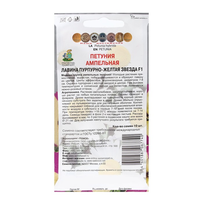 Молодые растения прямостоячие, вырастая, побеги свешиваются и образуют лавину из цветов. Цветы эффектные, воронковидные, диаметром 7-8 см. Окраска пурпурная с жёлтой звездой в центре. При высоких температурах и солнечной погоде на лепестках появляется нежно-розовый оттенок. Растение светолюбивое, засухоустойчивое, хорошо растет на любых питательных почвах. Посевы проводят в мае - июне. Драже выкладывают на поверхность хорошо увлажнённого субстрата без заделки в грунт. Драже обильно опрыскивают из пульверизатора для растворения оболочки. Контейнеры накрывают плёнкой для обеспечения максимальной влажности воздуха и субстрата в первые 7-10 дней после посева. При температуре почвы +18-20°C всходы появляются на 7-14 день. Сеянцы пикируют в фазе 2 настоящих листьев. Рассаду высаживают в мае, по 3 растения в подвесное капшо или вазон. Для получения наилучшего результата требуется прищипка.
