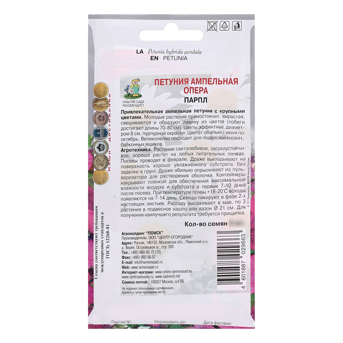 Привлекательная ампельная петуния с крупными цветами. Молодые растения прямостоячие, вырастая, свешиваются и образуют лавину из цветов (побеги достигают длины 70-80 см). Цветы эффектные, диаметром 8 см, пурпурной окраски. Цветет обильно с июня по октябрь. Великолепно подходит для подвесных корзин, балконных ящиков.Агротехника. Растение светолюбивое, засухоустойчивое, хорошо растет на любых питательных почвах. Посевы проводят в феврале. Драже выкладывают на поверхность хорошо увлажнённого субстрата без заделки в грунт. Драже обильно опрыскивают из пульверизатора для растворения оболочки. Контейнеры накрывают плёнкой для обеспечения максимальной влажности воздуха и субстрата в первые 7-10 дней после посева. При температуре почвы +18-20°C всходы появляются на 7-14 день. Сеянцы пикируют в фазе 2-х настоящих листьев. Рассаду высаживают в мае, по 3 растения в подвесное кашпо или вазон Ø 21 см. Для получения наилучшего результата требуется прищипка. Семена соответствуют требованиям международных стандартов и ГОСТу РФ 12260-81
