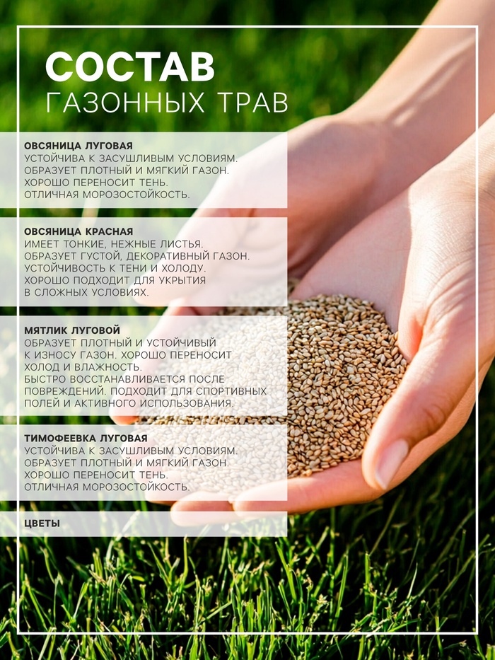 Состав газонных трав: Мятлик луговой, Цветы, Овсяница красная, Овсяница луговая, Тимофеевка луговая