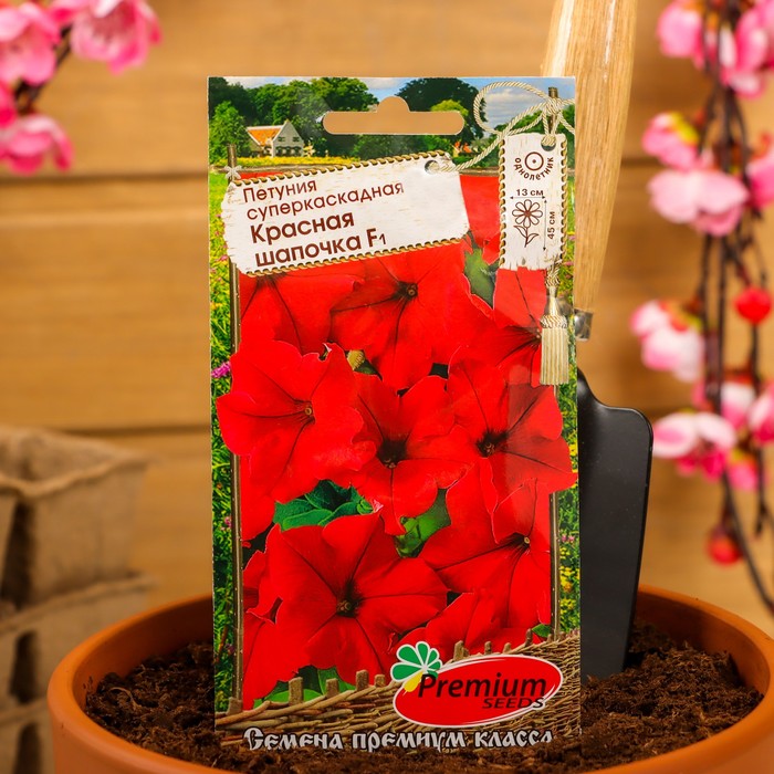 Суперкаскадная петуния «Красная шапочка» — это яркий однолетний сорт высотой 45 см. Растение усыпано многочисленными насыщенно-красными цветками диаметром до 13 см.