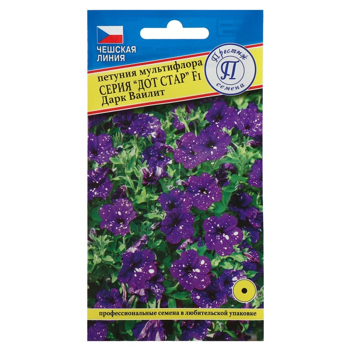 Однолетник. Бесконечную вселенную, звездное небо, тайны космоса, или простую радость и веселое настроение на Ваших клумбах, подоконниках или в вазонах могут производить своим необыкновенным видом уникальные гибриды новейшей серии Дот Стар Е1. Сочетание ярких и насыщенных окрасок цветков и белых крапинок или пятнышек дают цветкам совершенно новый и необыкновенно привлекательный вид. При жаркой или изменчивой погоде меняется форма, частотность и интенсивность белых рисунков на лепестках так, что каждый цветок является неповторимым оригиналом. Растения высотой 30-35 см, отлично ветвятся, обильно цветут, цветки диаметром 6-7 см темно-фиолетового цвета с белым.