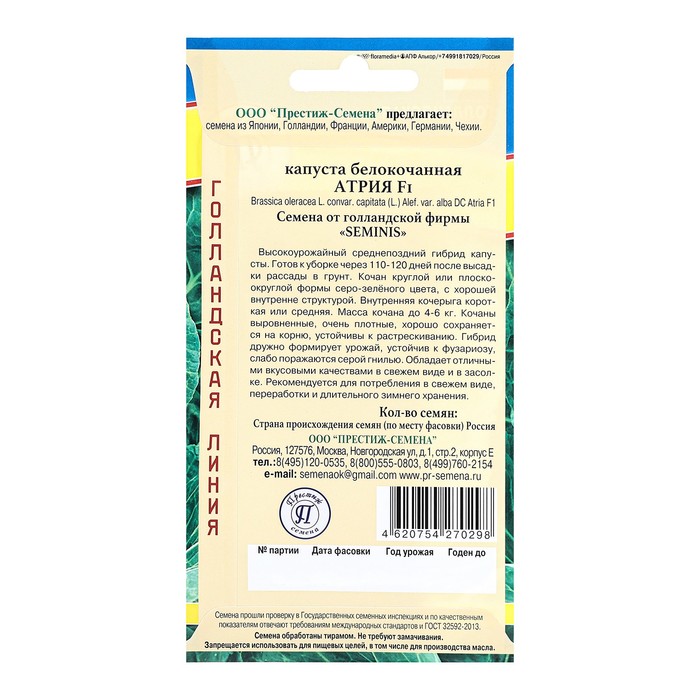 Высокоурожайный среднепоздний гибрид капусты. Готов к уборке через 110-120 дней после высадки рассады в грунт. Кочан круглой или плоско-округлой формы серо-зелёного цвета, с хорошей внутренне структурой. Внутренняя кочерыга короткая или средняя. Масса кочана до 4-6 кг. Кочаны выровненные, очень плотные, хорошо сохраняется на корню, устойчивы к растрескиванию. Гибрид дружно формирует урожай, устойчив к фузариозу, слабо поражаются серой гнилью. Обладает отличными вкусовыми качествами в свежем виде и в засолке. Рекомендуется для потребления в свежем виде, переработки и длительного зимнего хранения.