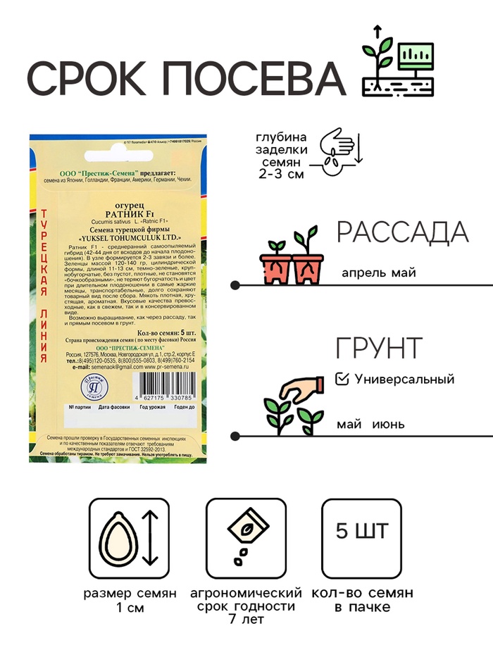 Посев Огурца Ратник F1 на рассаду – в конце апреля. Высадка рассады в грунт – в конце мая – начале июня. Посев в грунт – в мае – июне. Плодоношение через 33-35 дней от высева. Рекомендуются регулярные поливы тёплой водой, подкормки минеральными и органическими удобрениями. Нерегулярные сборы плодов снижают урожайность и качество плодов.