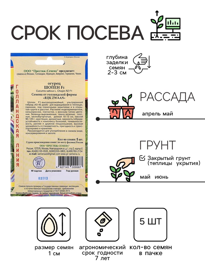Шопен F1-высокоурожайный, ультраранний гибрид (43-45 дней) для выращивания в теплицах, парниках, под пленочными укрытиями и в открытом грунте в расстил. Растение индетерминантное, сильнорослое, плетистое, с женским типом цветения. Зеленцы выровненные, темно-зеленые, плотные, мелкобугорчатые, длиной 10-13 см, массой 90-120 г, хрустящие, ароматные. Ценность гибрида: устойчивость к комплексу болезней, теневыносливость, раннее и дружное плодоношение, высокая урожайность и стандартность, пригодность к транспортировке и хранению. Рекомендуется для употребления в свежем виде, консервирования и засола.
