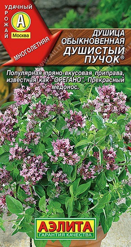 Душица (орегано) – ароматный лекарственный многолетник, отличный медонос. Растения формируют хорошо облиственные кустики высотой 25-30 см,  диаметром 45-50 см. Свежая и сушеная зелень дущицы используется в кулинарии в качестве пряно-вкусовой приправы и для приготовления чая. Уборку урожая проводят во время цветения, начиная со второго года вегетации. Растения срезают на высоте 15-20 см от поверхности почвы.
