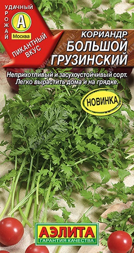 Неприхотливый и засухоустойчивый сорт кориандра. Первые листья можно срывать через 35-45 дней после всходов. Растения прямостоячие, средних размеров, хорошо облиственные, к началу цветения высотой 40-50 см. Свежая зелень кориандра давно стала неотъемлемой частью обеденного стола, придавая пикантный вкус и неповторимость любому блюду. Кинзу легко вырастить не только на грядке, но и в домашних условиях, т.к. она не требует большого внимания и ухода. Сорт подходит для подзимнего посева.