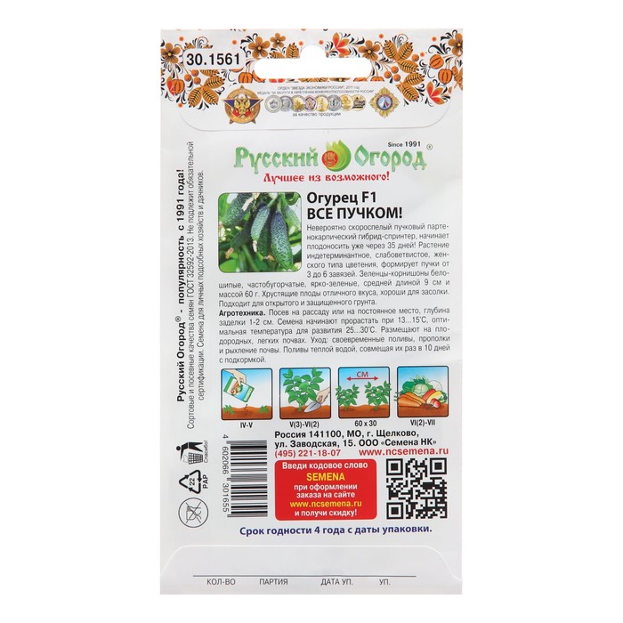 Невероятно скороспелый партенокарпик-спринтер начинает плодоносить уже через 35 дней! Растение индетерминантное, женского типа цветения, формирует в узлах до 6 завязей. Хрустящие корнишоны отличного вкуса, длиной 9 см и массой 60 г, хороши для засолки. Для открытого и закрытого грунта. Устойчив к комплексу болезней.