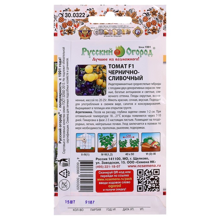 Семена Томат "Чернично-сливочный" смесь F1, серия Русский огород, 15